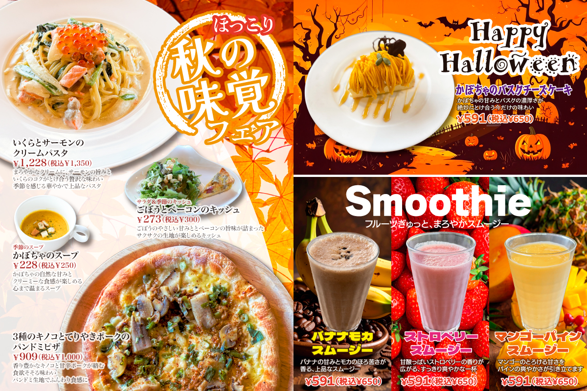 2025.10.09 新作メニュー 「ほっこり 秋の味覚フェア」開催 深まる秋に合わせて「ほっこり 秋の味覚フェア」開催好評のパンドミピザ第2弾や、クリームパスタと魅力あるメニューを揃えました。また、スムージーも種類が増えましたので必ず好きな味を見つけられます。